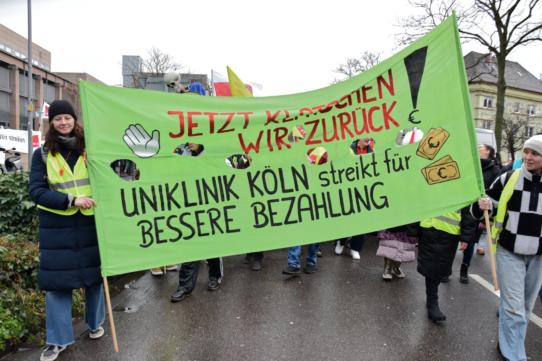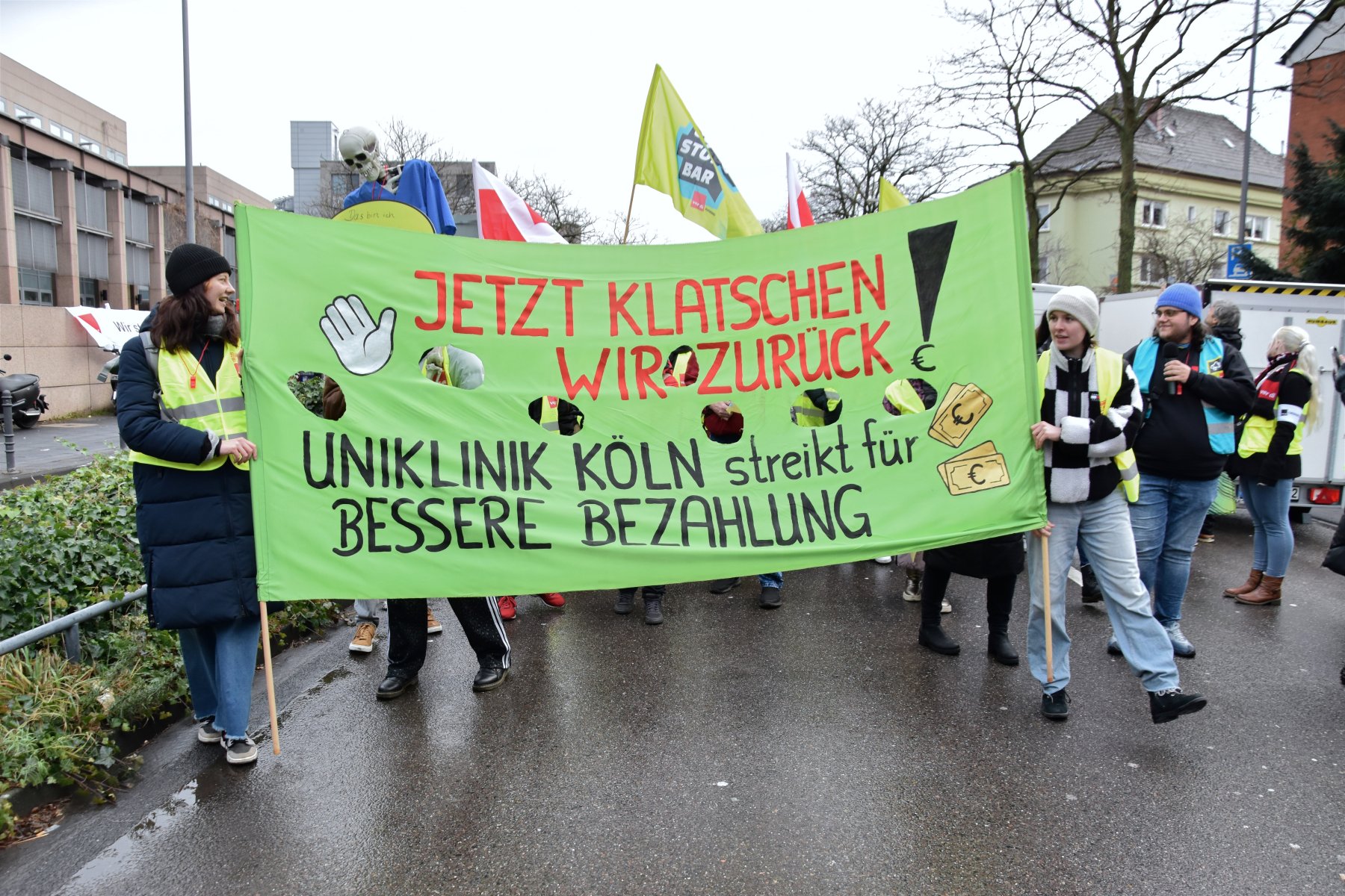 Die Gewerkschaft Verdi hatte die Beschäftigten in Pflege, Service und Verwaltung mobilisiert. In der Frühschicht legten nach Gewerkschaftsangaben rund 200 Mitarbeitende am Kölner Klinikstandort die Arbeit nieder, um gemeinsam auf die Anliegen der Belegschaft aufmerksam zu machen – von besseren Arbeitsbedingungen bis zu einer angemessenen tariflichen Bezahlung. Die Aktionen in Bonn, Essen und Düsseldorf begannen zeitgleich.
